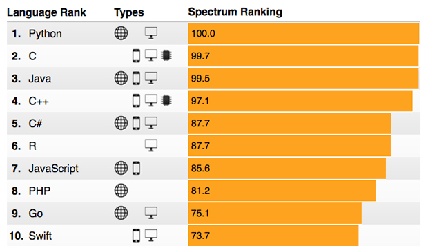 IEEE Spectrum has recently published its fourth annual ranking of Top Programming Languages for the year 2017. Python which was on third step in 2016 ranking has climbed up to the first position leading the list of Top 10 programming languages.